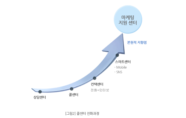 모바일과 SNS는 이전의 컨택센터에서 스마트센터로 옮겨가는 결정적 역할을 수행하게 되었고 스마트센터에서는 컨택센터보다 실시간(Real Time)으로 고객과 소통하며 실시간으로 고객이 온라인에서 대화하고 있는 모든 정보들을 수집하고 분석하게 됨에 따라 마케팅 의사결정을 위한 지원센터로서의 새로운 역할을 책임져야 할것이다. 그림2는 콜센터의 진화 과정이 스마트센터로 점차 고도화되고 마케팅 지원센터로서의 역할을 수행해야 한다는 것을 전제로 표현하였다.